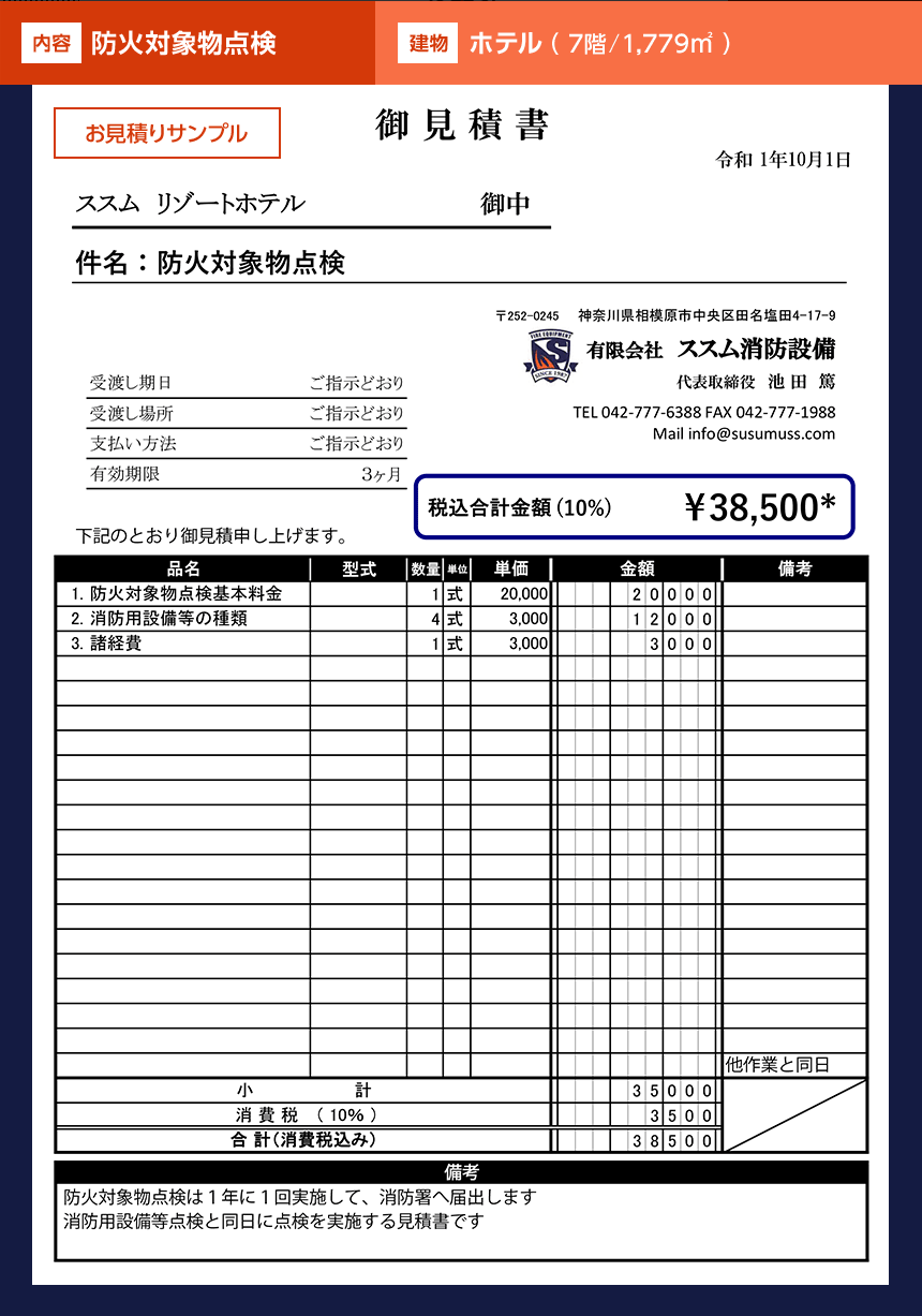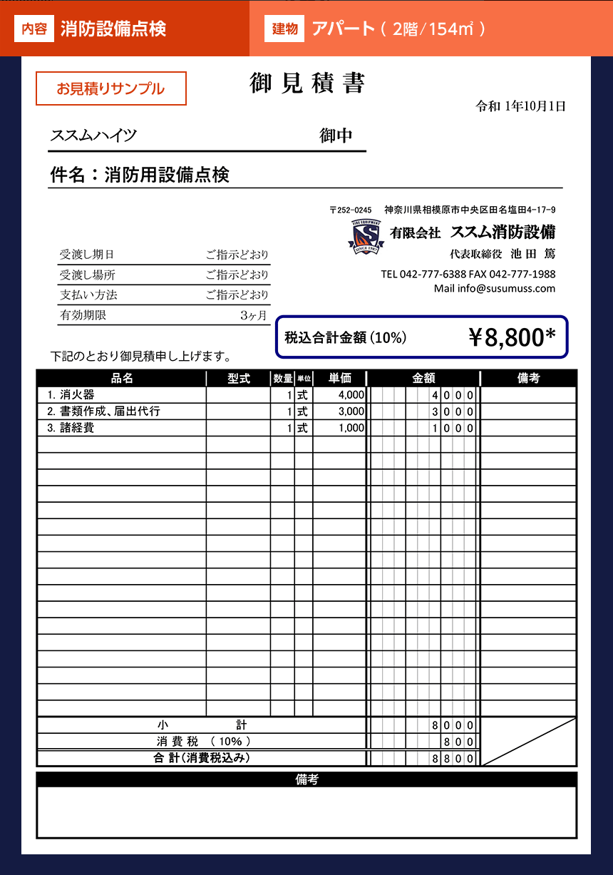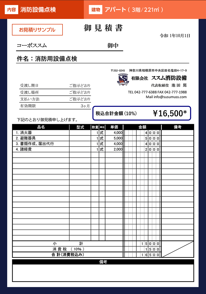 | 建物 | 階数/面積 | 点検内容(一部) | お見積り例 |