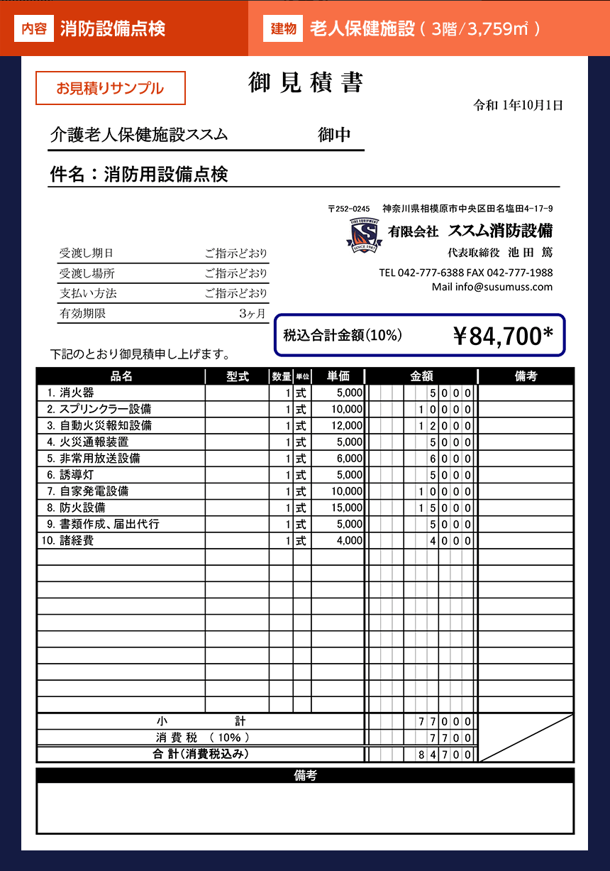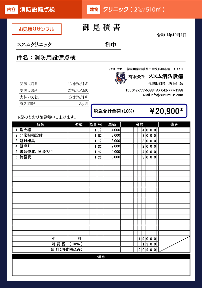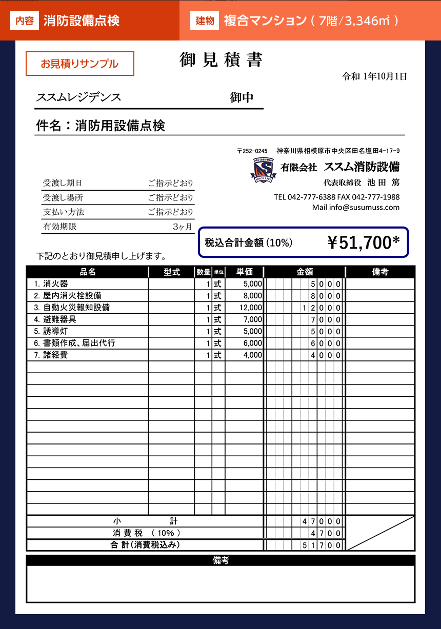 ※お見積り例は点検費用です。機器・器具などの交換、新設が必要な場合は別途お見積りとなります。