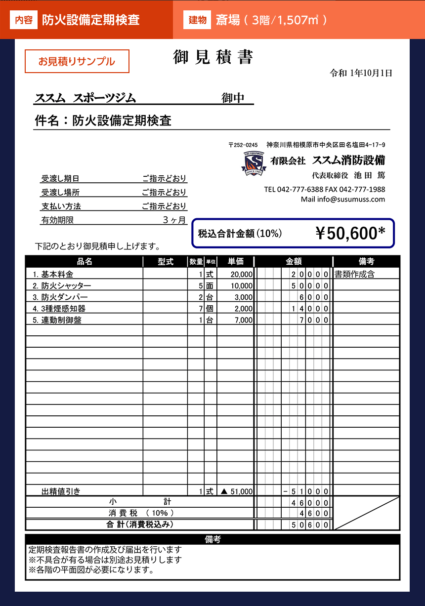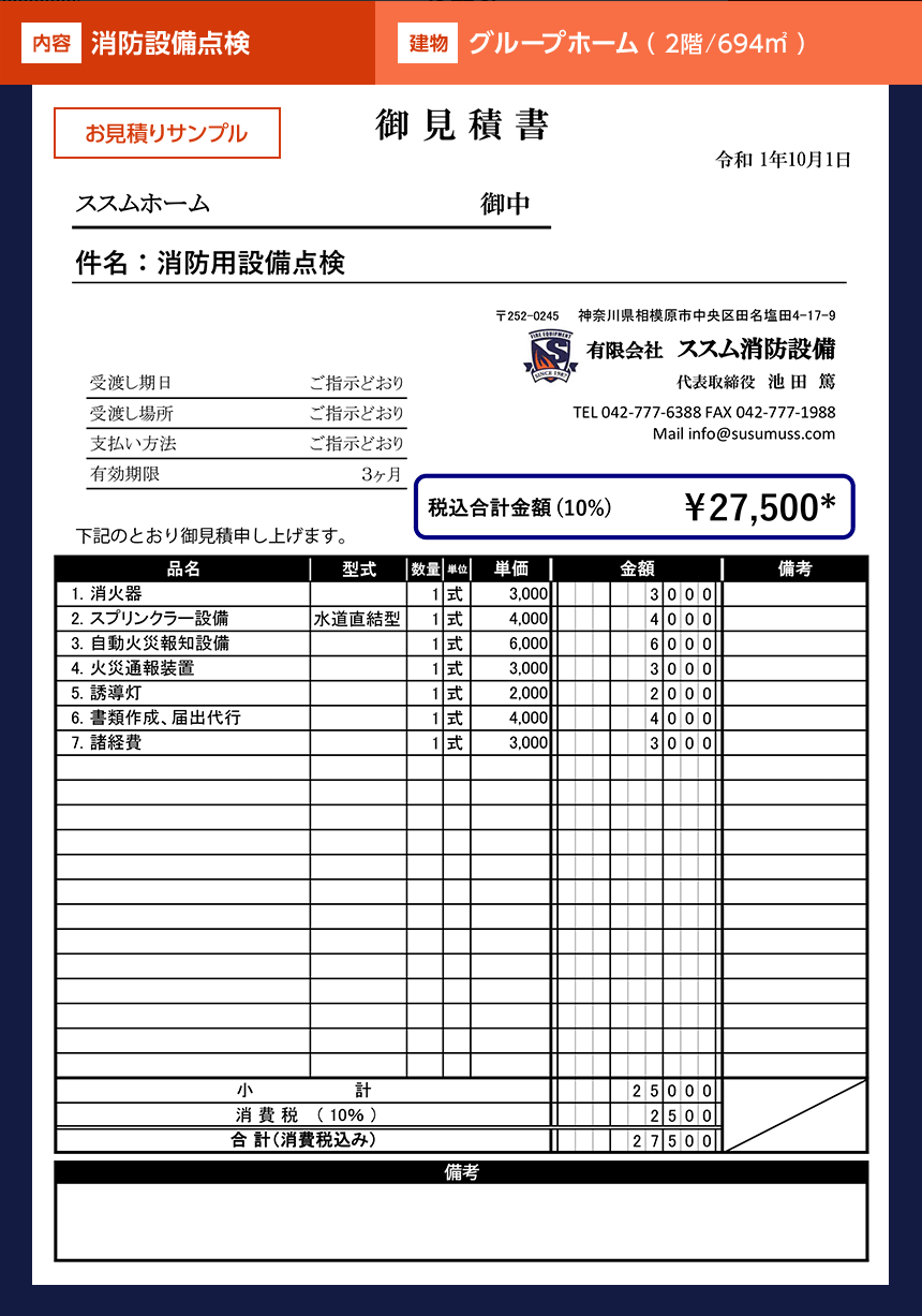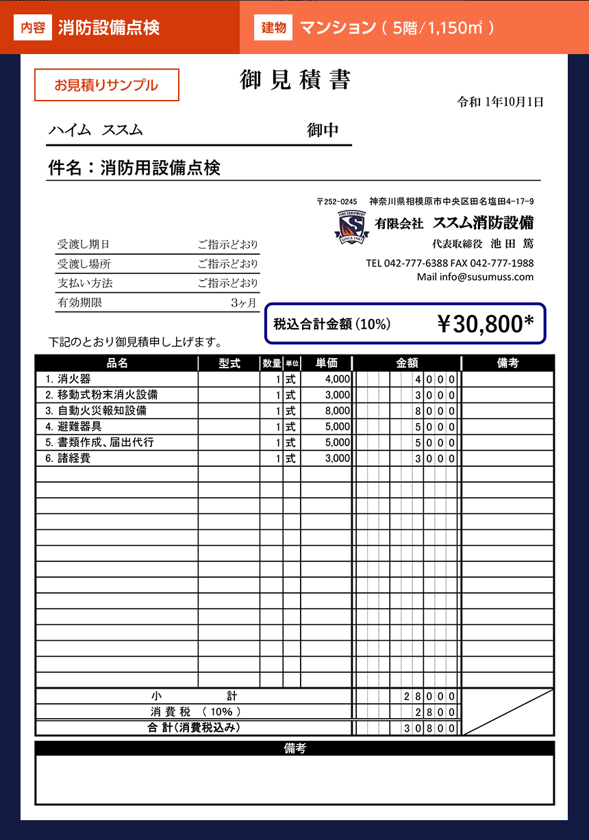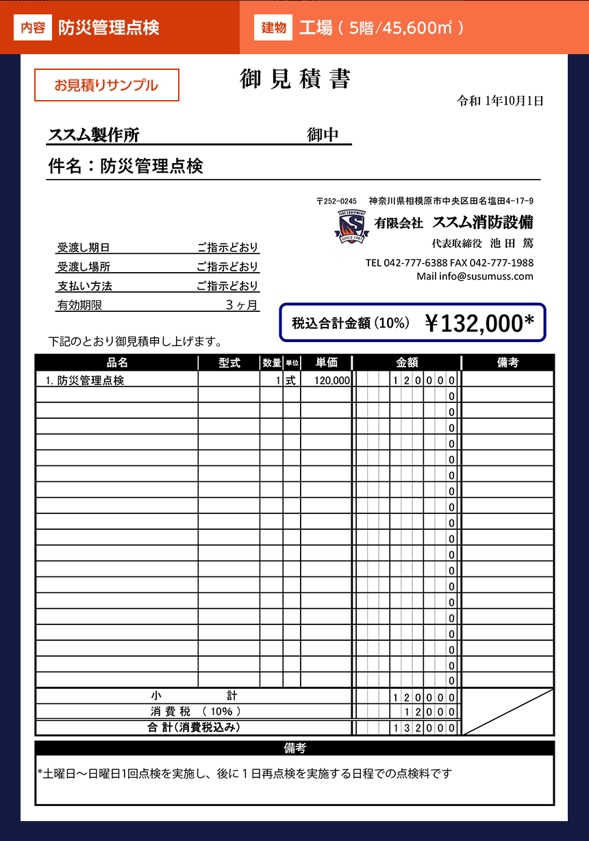 ※お見積り例は点検費用です。機器・器具などの交換、新設が必要な場合は別途お見積りとなります。