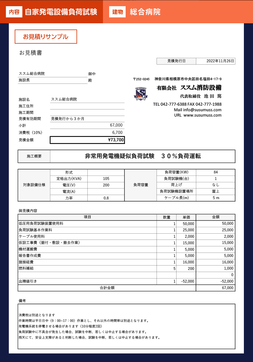 | 総合病院 | - | 疑似負荷試験装置、実負荷等により、 定格回転速度及び 定格出力の30%以上の 負荷で必要な時間連続運転 を行い確認する |